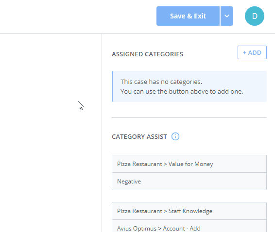 Categories now have their own area on the right hand side of the page. At the top you’ll see the categories you’ve assigned to the case. You can click ‘Add’ to add a new blank category, then select an option for each category area. This means you can quickly update categories which have already been added without having to delete them and start over.