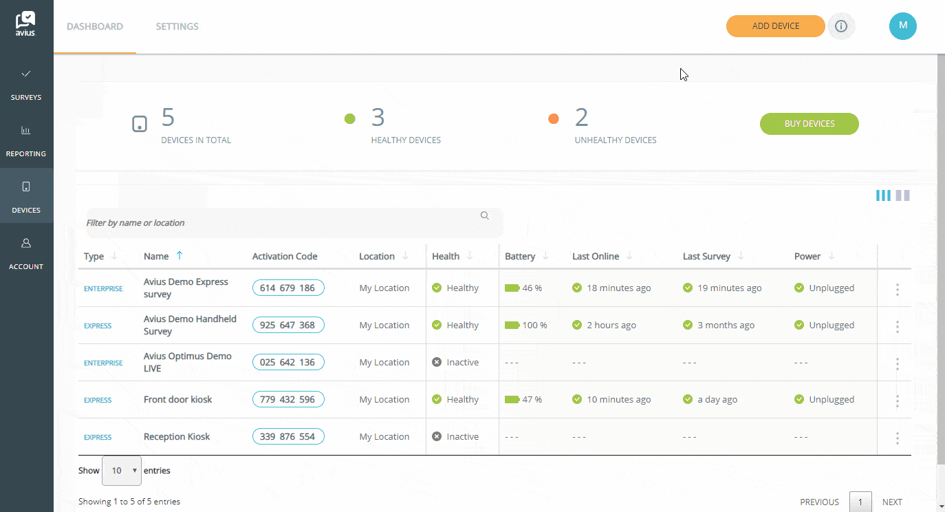 Loginto Avius Surveys and click on Device in the left-hand menu to see your list of devices.
