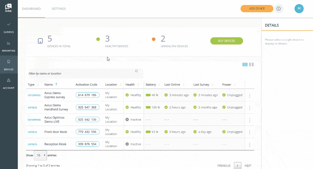 Loginto Avius Surveys and click on Device in the left-hand menu to see your list of devices.