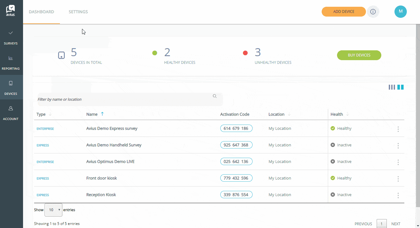 First, login to Avius Surveys, then click on Device in the left-hand menu.